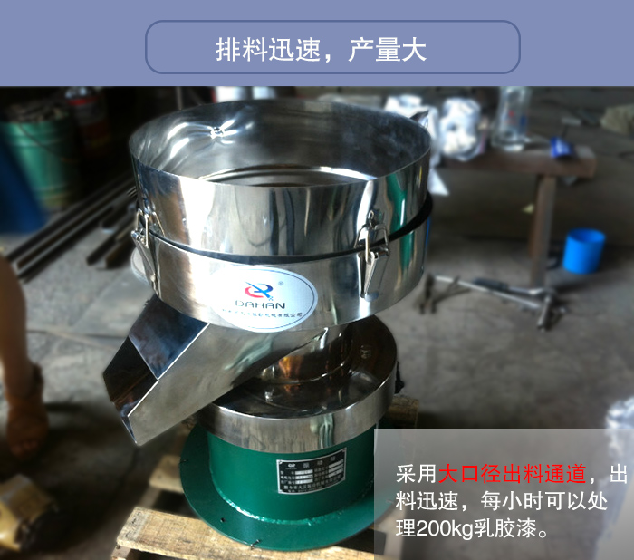 450過濾篩采用大口徑出料通道,出料迅速,每小時可以處理200kg乳膠漆。