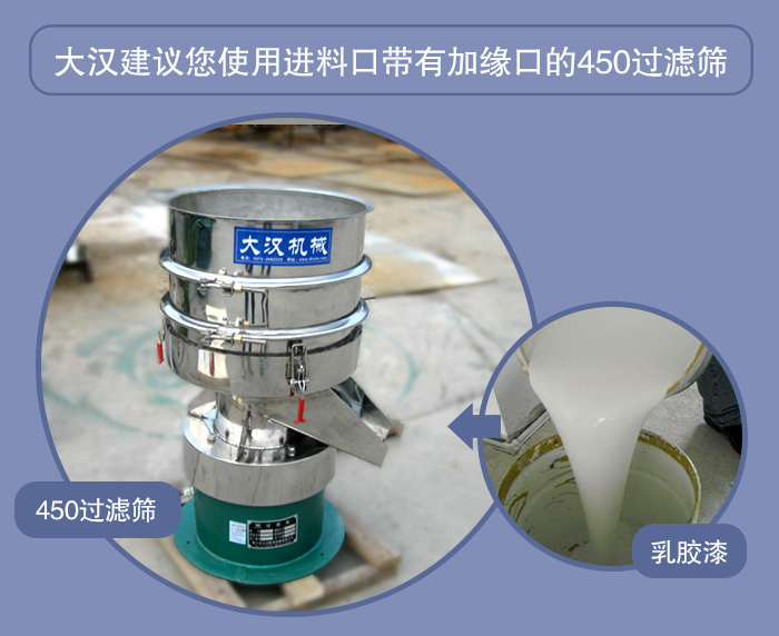 乳膠漆是一種帶有一定黏稠度的漿液,但是在其進(jìn)行加工過程中,需要使用振動篩對其進(jìn)行除雜過濾,由于考慮到乳膠漆在篩分過程中可能發(fā)生的漏液、飛濺情況,大漢小編建議大家使用使用進(jìn)料口帶有加緣口的450過濾篩進(jìn)行篩分。
